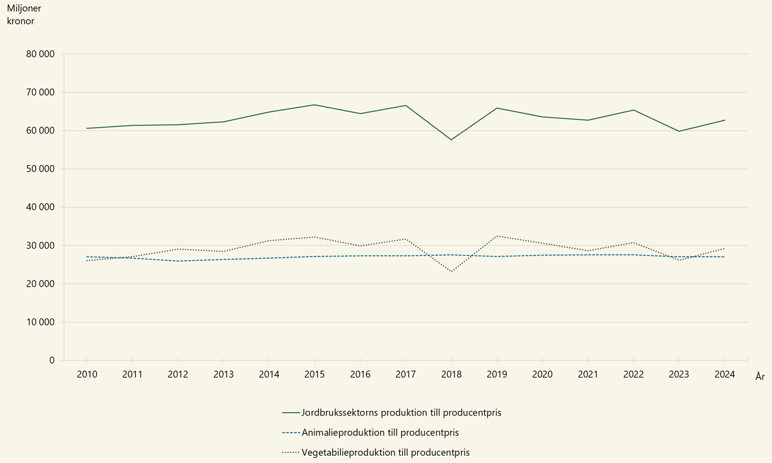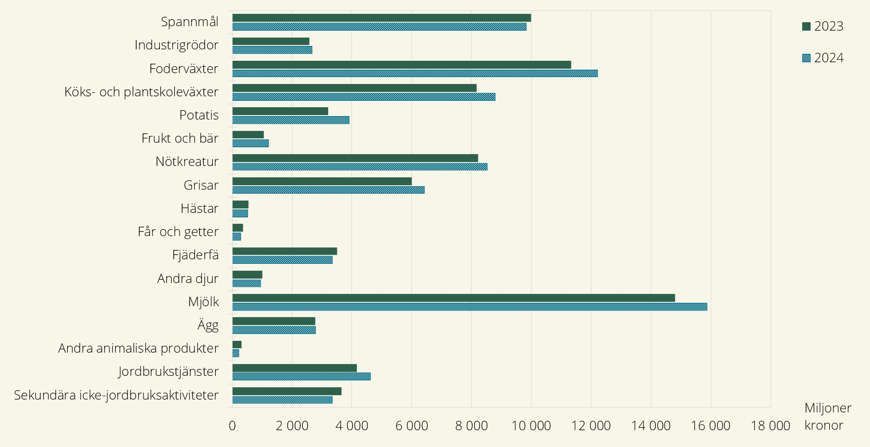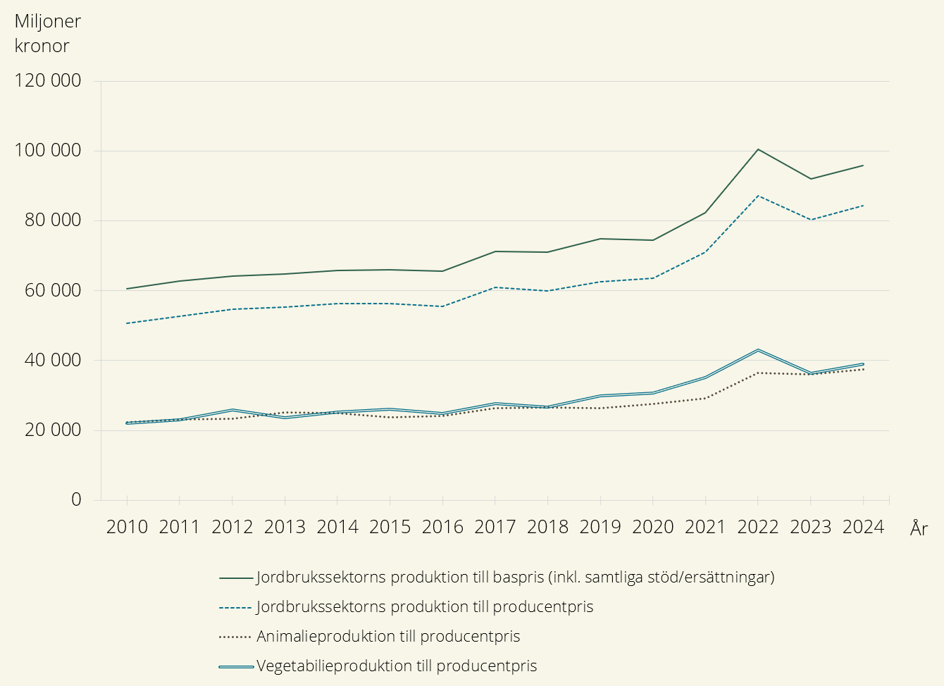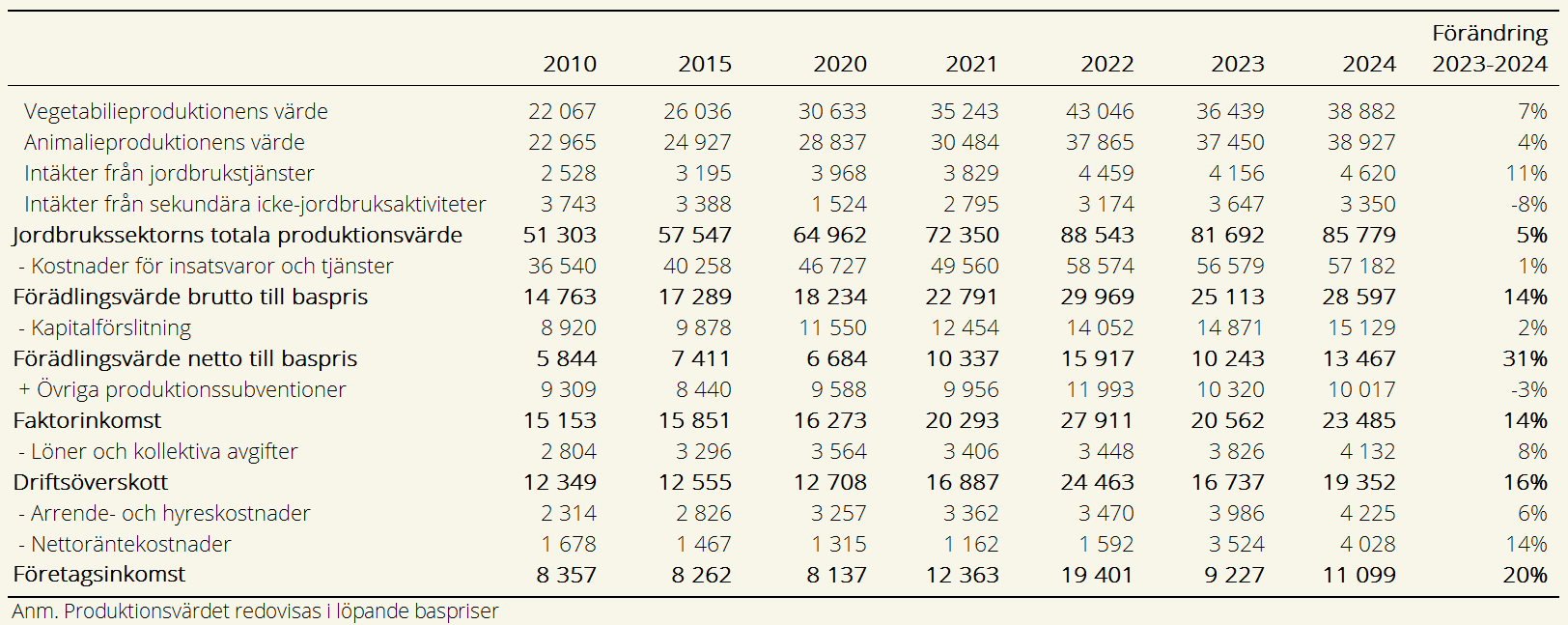 2023 kännetecknades av sjunkande avräkningspriser samtidigt som spannmålsskörden var ovanligt låg och räntekostnaderna steg. Därför halverades 2023 års företagsinkomst. År 2024 beräknas den återhämta sig något. Jordbrukssektorns totala produktionsvärde uppgick 2024 till 85,8 miljarder kronor, 4,1 miljarder mer än 2023. Produktionsvärdet ökade både för vegetabilie- och animalieproduktionen.