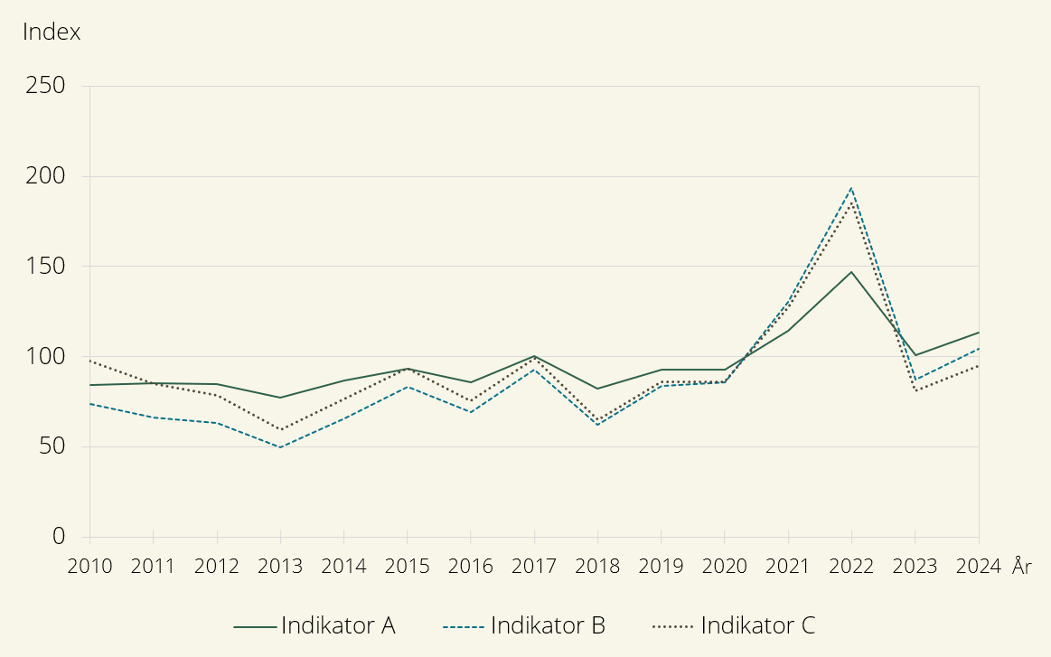 - Tabell 3. Indikator A, B och C 2010–2024, index 2019–2021=100