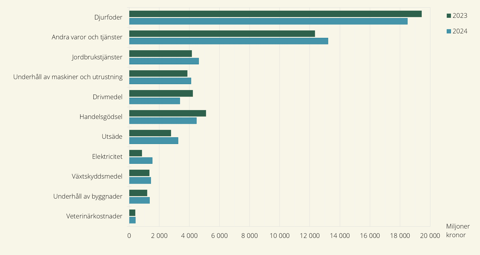 Den största minskningen i relativa tal stod kostnaderna för drivmedel för, de minskade med 20 %, eller knappt 0,9 miljarder kronor, till 3,4 miljarder kronor år 2024. Även för gödsel sjönk kostnaderna, med 0,6 miljarder kronor eller 12 %. Men de andra kostnadsposterna; Utsäde, Växtskyddsmedel, Veterinärkostnader, Underhåll av maskiner, utrustning och byggnader, Jordbrukstjänster samt Andra varor och tjänster, ökade alla. Elpriset sjönk under 2024, men kostnaden för elektricitet har ökat. Det beror på att elstödet för företag, som beslutades av regeringen i oktober 2022, togs bort och därför inte längre dras från elkostnaderna i 2024 års EAA-beräkningar.