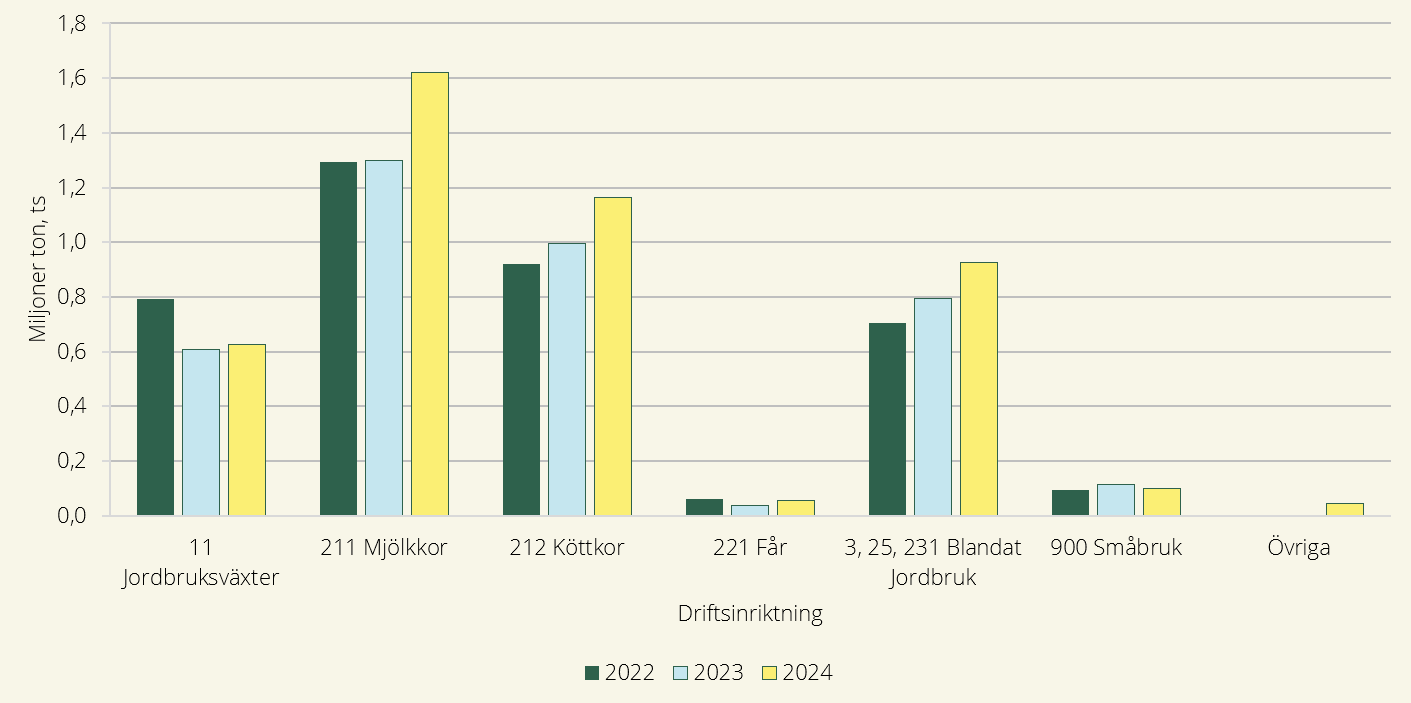 Förstora bildenFigur 1. Den årliga bärgade vallskörd för perioden 2022–2024 uppdelat på driftsinriktning, miljoner ton, ts.