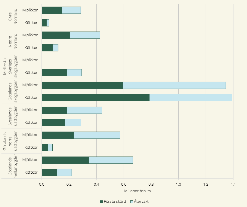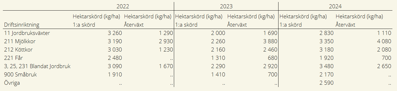 Driftsinriktningen Mjölkkor skiljer sig från de övriga driftsinriktningarna. Alla driftsinriktningar, förutom Mjölkkor, har vid minst två av tre observationsår haft en högre hektaravkastning från första skörden än från återväxten. För driftsinriktningen Mjölkkor gäller motsatsen, där har hektaravkastningen från återväxten varit större än hektaravkastningen från första skörden vid två av tre tillfällen. År 2023 var hektaravkastningen från återväxt 72 % större än hektaravkastningen från första skörd. 3 900 kilogram per odlad hektar togs som återväxt det året, medan första skörden avkastade 2 300 kilogram per odlad hektar. År 2024 var hektaravkastningen från återväxten 4 100 kilogram per hektar, vilket var 22 % högre än hektaravkastningen från första skörd, 3 400 kilogram per hektar.