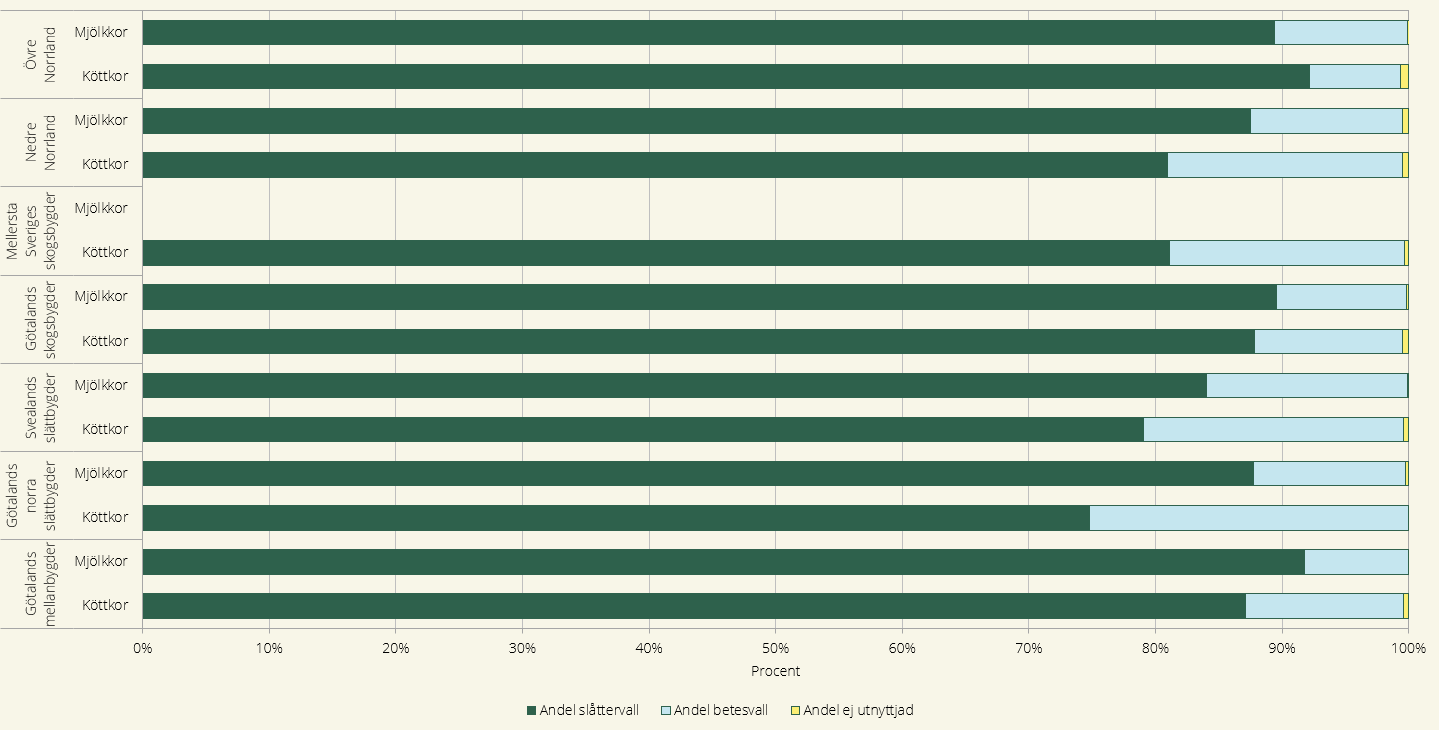 I nästan alla produktionsområden har företagen med inriktning Mjölkkor en större andel arealer slåttervall än inriktningen Köttkor. Endast i produktionsområde Övre Norrland hade driftsinriktningen Köttkor en högre andel slåttervall än driftsinriktningen Mjölkkor, sett till de genomsnittliga arealerna under perioden.