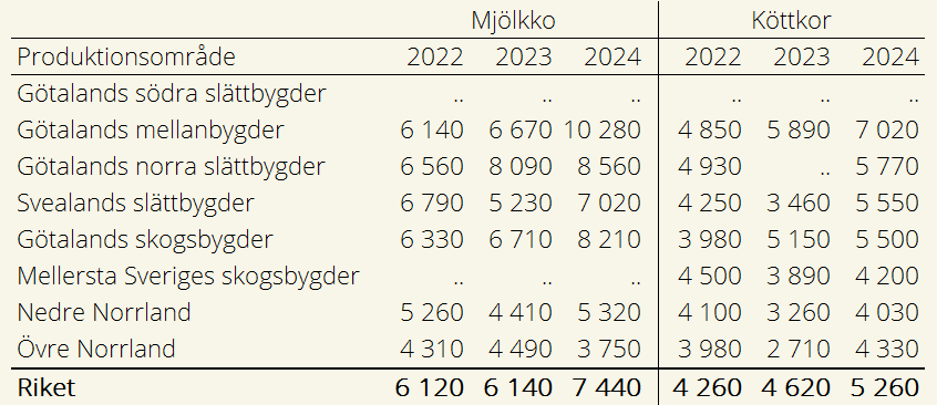 För driftsinriktningarna Mjölkkor och Köttkor kan vi bryta ner statistiken på produktionsområdesnivå. Den högsta hektarskörden noterades för båda driftsinriktningarna i Götalands mellanbygder år 2024. År 2024 var hektarskörden 10 280 kilogram per hektar för driftsinriktningen Mjölkkor och 7 020 kilogram per hektar för driftsinriktningen Köttkor i Götalands mellanbygder. Det innebar att hektarskörden var 20 % respektive 22 % högre för driftsinriktningarna Mjölkkor och Köttkor i Götalands mellanbygder, jämfört med produktionsområdet med den näst högsta hektarskörden år 2024.
