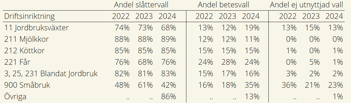 Sett till alla driftsinriktningar förblev i genomsnitt 5 % av vallarealerna outnyttjade varje år. Företag med en inriktning mot djur: Mjölkkor, Köttkor, Får och Blandat jordbruk brukade en större andel av sin odlade vallareal än andra driftsinriktningar. Under perioden 2022–2024 översteg aldrig andelen ej utnyttjad vall 1 % av den totala arealen vall i företagen med driftsinriktning Mjölkkor och Köttkor.