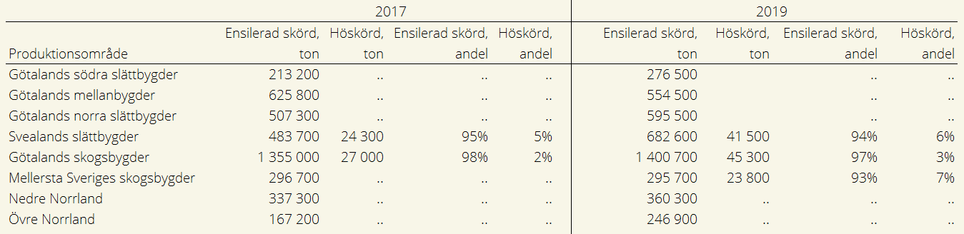 I tablå 5 visas hur mycket av vallskörden som är höskörd respektive ensilerad skörd per produktionsområde för år 2017 och 2019. I produktionsområde Götalands skogsbygder användes nästintill uteslutande ensilering som metod vid vallskörden. År 2017 utgjorde den ensilerade vallskörden 98 % av den totala skördevikten i ts. År 2019 var samma andel i produktionsområde Götalands skogsbygder 97 %.