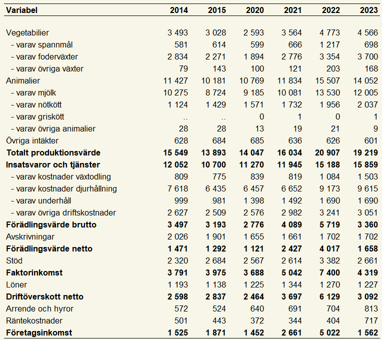 Mellan 2022 och 2023 minskade däremot det totala produktionsvärdet för specialiserade mjölkföretag. Det berodde på en negativ nettoeffekt av den något ökade invägningen av mjölk som inte uppvägde och balanserade ut de lägre avräkningspriserna. Även kostnaderna för insatsvaror och tjänster fortsatte att vara på en hög nivå 2023.