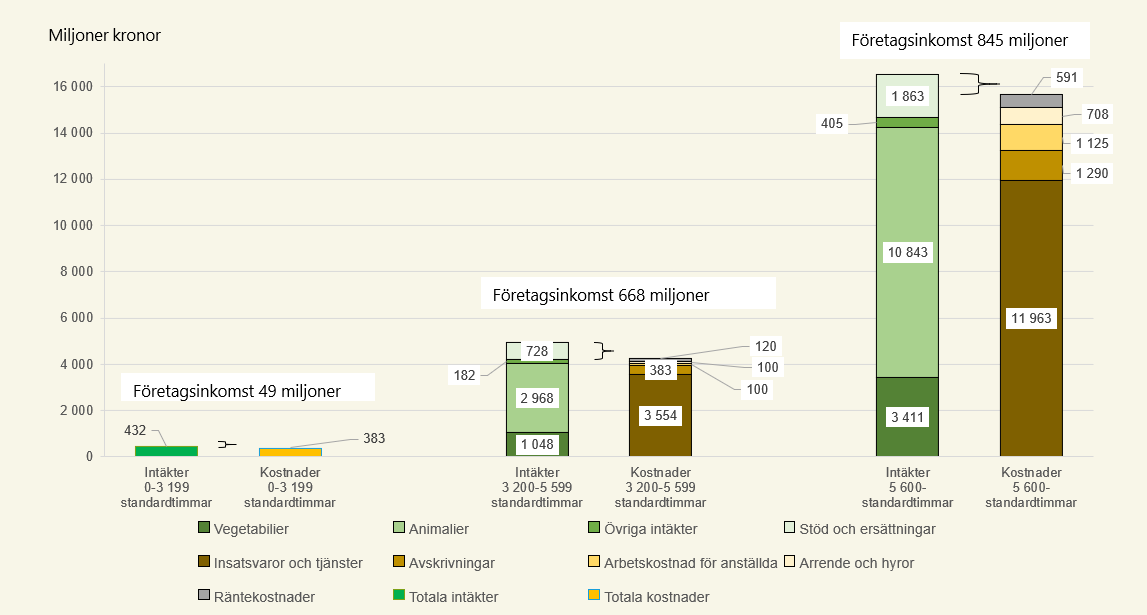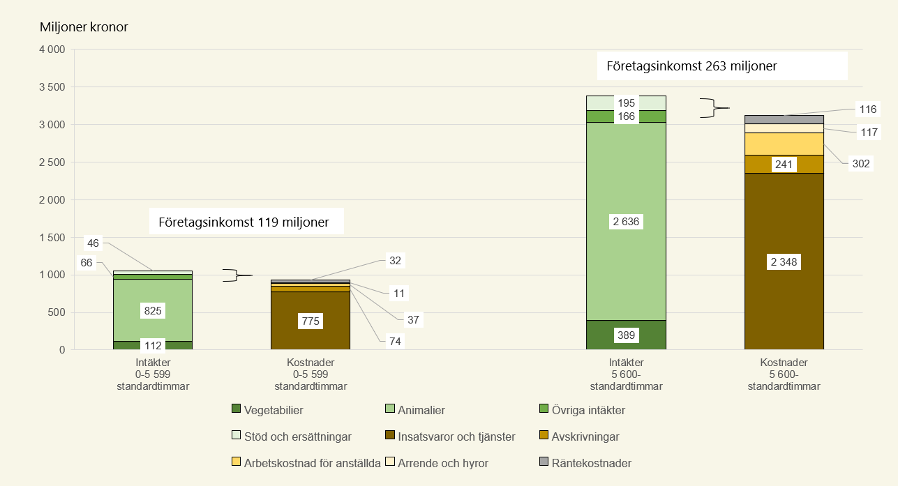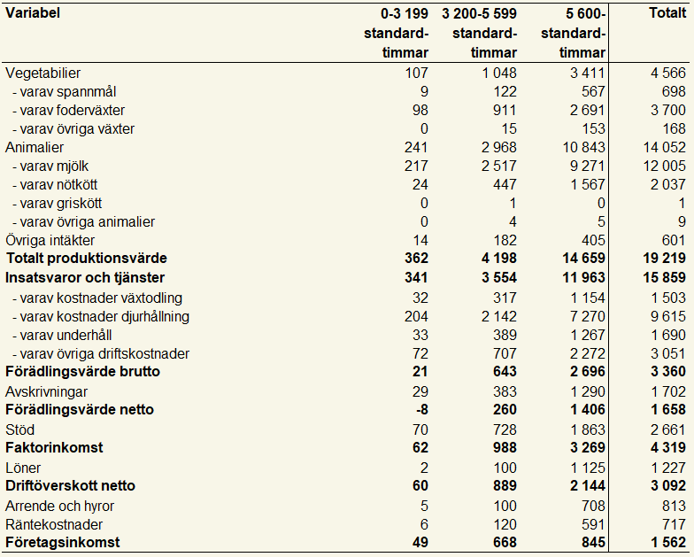 This report contains data per type of farming and standardised work requirement. Focus has been placed on holdings with dairy cows, beef and pigs. This report contains statistics on holdings for Sweden as a whole, for different national areas and for different size groups. The report also relates to data from the Economic accounts for agriculture (EAA).