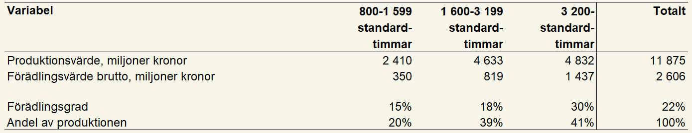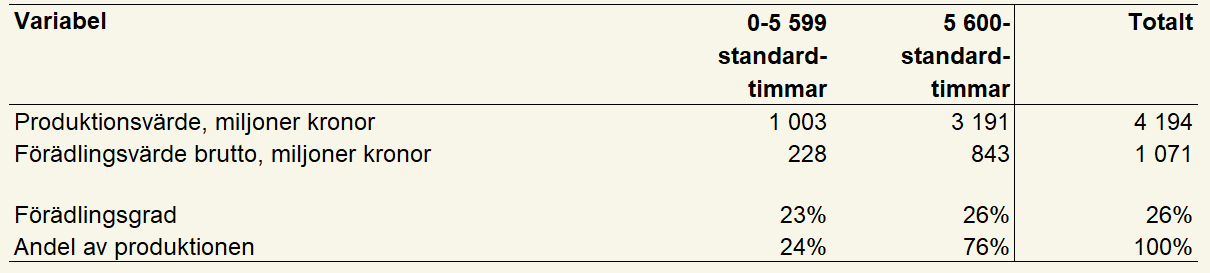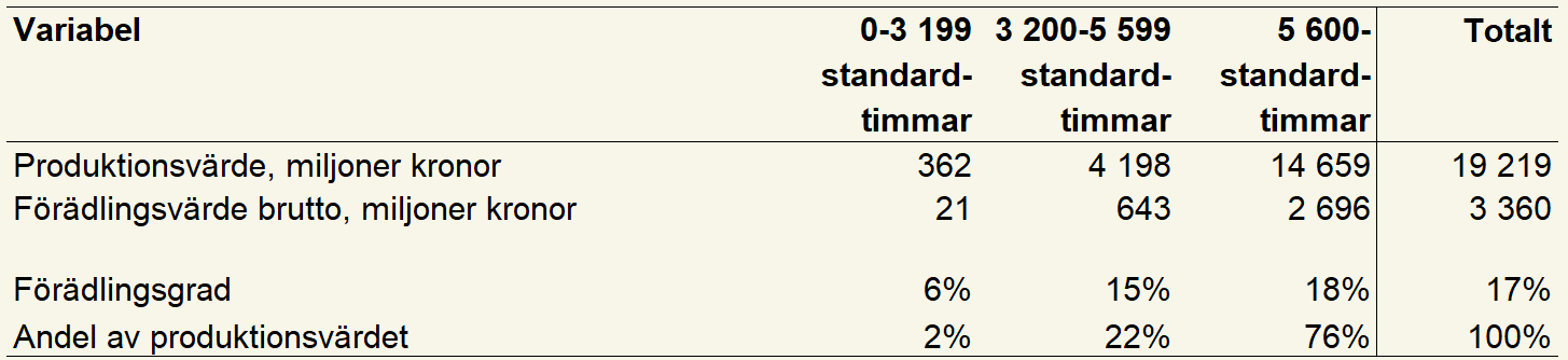 De största mjölkföretagen, det vill säga företagen med minst 5 600 standardtimmar, stod för drygt tre fjärdedelar av produktionsvärdet, de mellanstora stod för drygt en femtedel och de mindre för 2 % 2023 (Tablå 7). Sett till förädlingsgraden så skilde sig även den åt mellan de olika storleksgrupperna, där de mindre företagen hade lägst förädlingsgrad. De mindre mjölkföretagen hade en förädlingsgrad på 6 %, mellanstora 15 % och de största företagen 18 %. Förädlingsgraden 2023 var lägre än genomsnittet för åren 2014–2022, oberoende av storleksgrupp. För de största specialiserade mjölkföretagen var förädlingsgraden 2023 dessutom den lägst uppmätta under 10 årsperioden. Detta gäller oberoende av om man räknar bort värdet av egenproducerat foder.