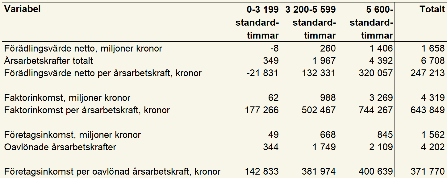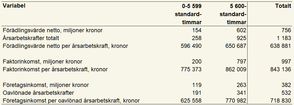 Nettoförädlingsvärdet per årsarbetskraft, avlönad och oavlönad, var nästan 250 000 kronor (Tablå 4) för specialiserade mjölkföretag och nästan 160 000 kronor för svenska jordbruksföretag i genomsnitt enligt EAA 2023. De specialiserade mjölkföretagen hade därmed ett nettoförädlingsvärde per årsarbetskraft som var ungefär 55 % högre än genomsnittet för de svenska jordbruksföretagen.
