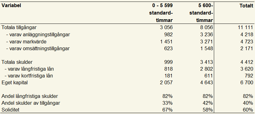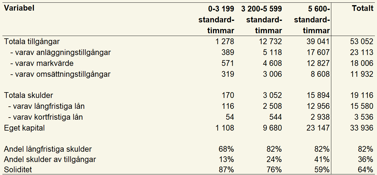 Specialiserade mjölkföretag med mer än 5 600 standardtimmar har haft en ökande andel av mjölkföretagens totala tillgångar, skulder och eget kapital. Skulderna ökade emellertid i betydligt mindre utsträckning varför de stora företagens soliditet blev högre 2023 jämfört med genomsnittet för åren 2014–2022 (Tablå 9).