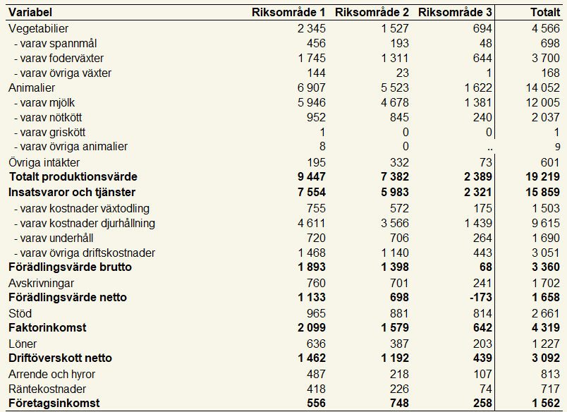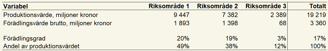 Mjölkföretagen i riksområde 1, det vill säga företag belägna i slättbygderna i södra och mellersta Sverige, genererade 56 % av förädlingsvärdet brutto 2023 (Tablå 10). Företagen i riksområde 2, det vill säga i skogs- och dalbygderna i södra och mellersta Sverige, genererade 42 % medan företagen i riksområde 3 (norra Sverige) genererade 2 % av förädlingsvärdet brutto. Även kostnaderna i produktionen i förhållande till produktionsvärdet var betydligt lägre för mjölkföretagen i riksområde 1 och 2 jämfört med i riksområde 3.