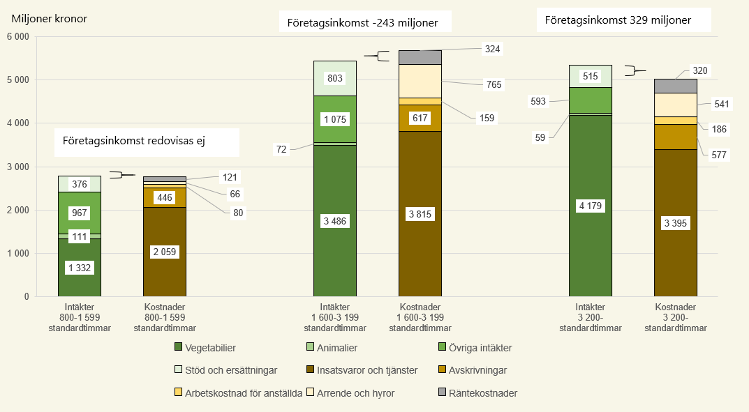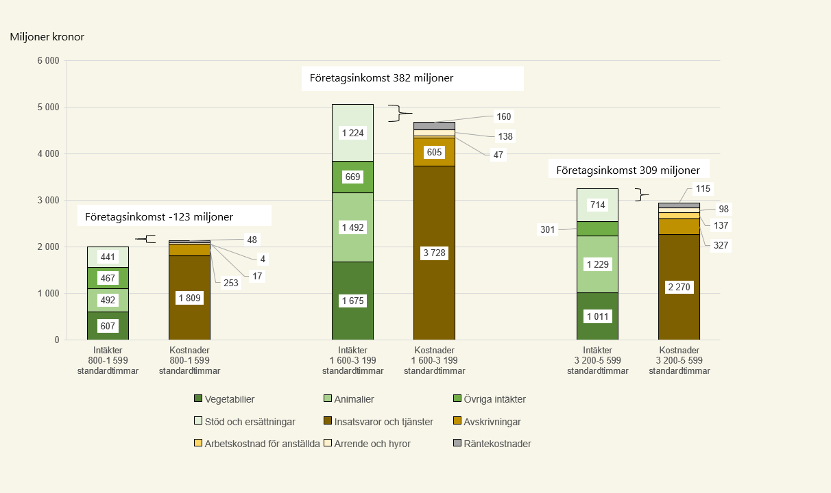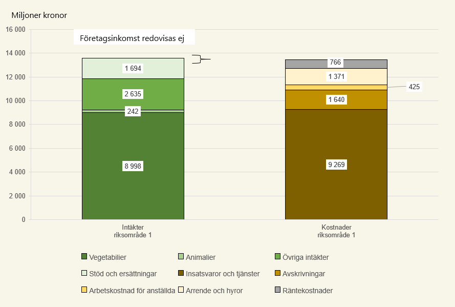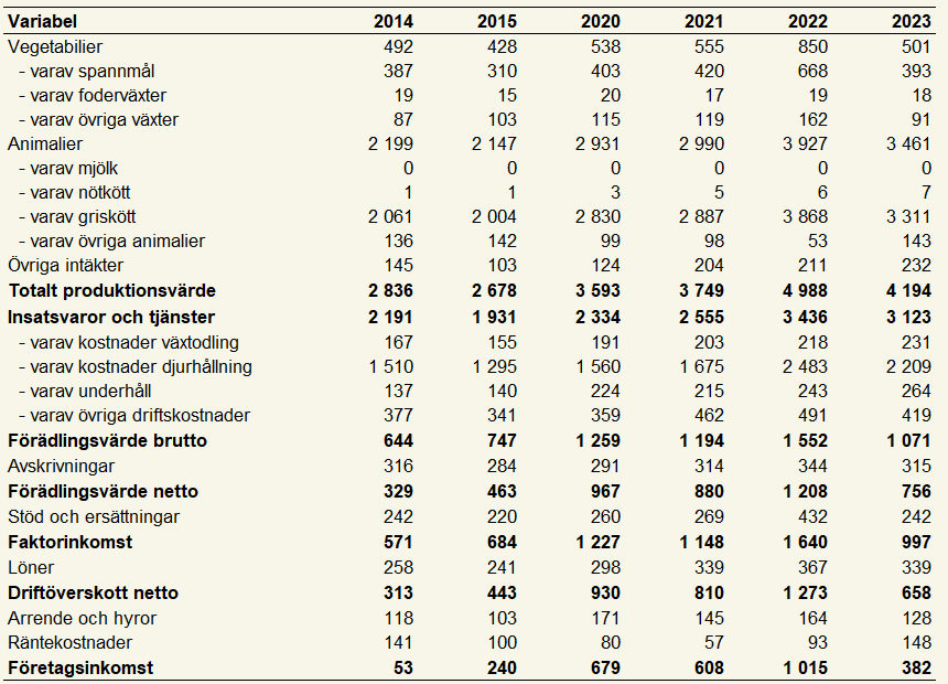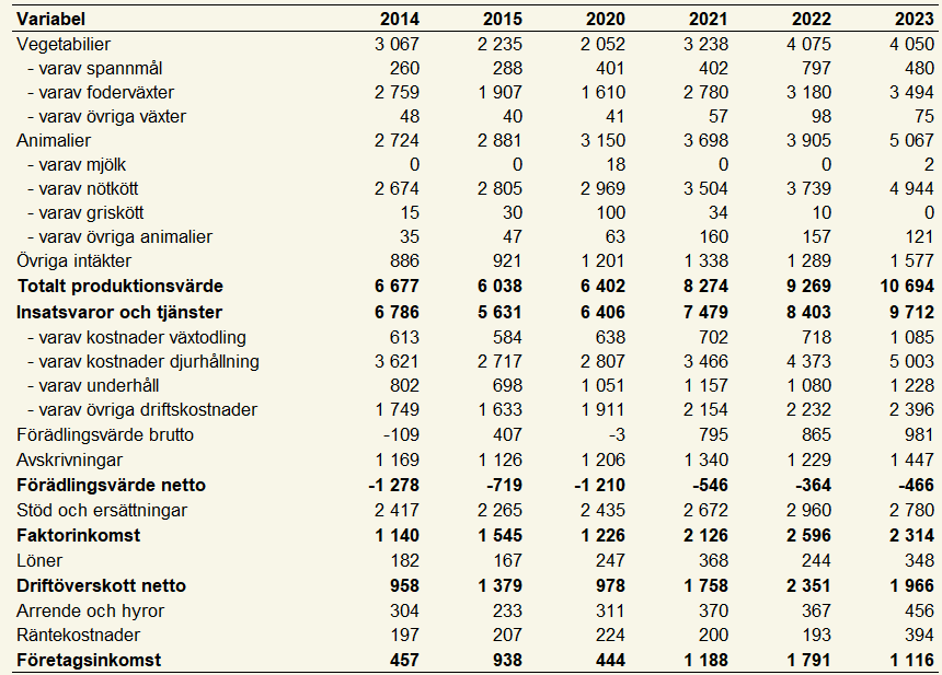 Faktorinkomsten varierade mellan 3,2 och 7,4 miljarder kronor under åren 2014–2023. Noterbart var att stöden och ersättningarna var högre såväl 2019 som 2022 än övriga år. Det berodde på de retroaktiva stöd och ersättningar som betalades ut på grund av torkan 2018 samt ersättningarna på grund av höga energi- och insatsvarupriser 2022.