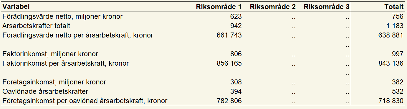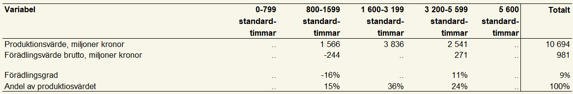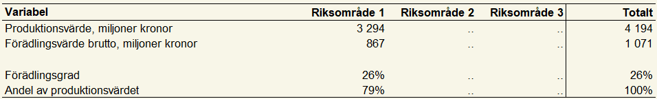 - Förädlingsgrad i procent, (som är kvoten mellan Totalt produktionsvärde minus Kostnader för insatsvaror och tjänster, som divideras med Totalt produktionsvärde).