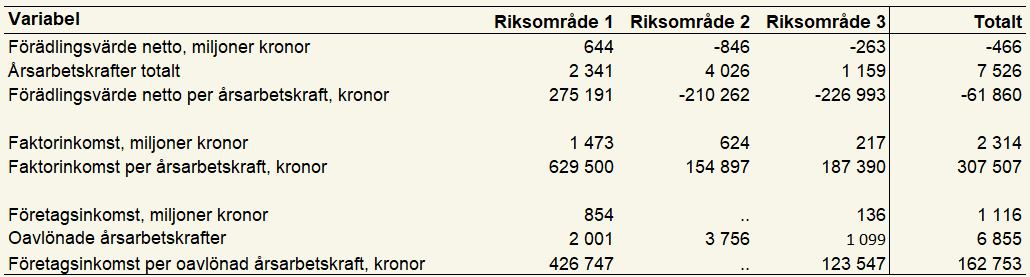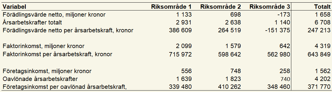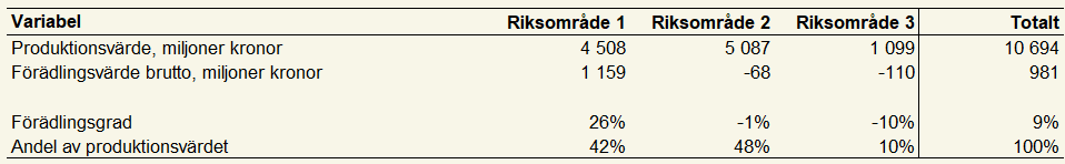 Förädlingsvärdet netto i riksområde 3 var negativt år 2023, vilket betyder att specialiserade mjölkföretag i riksområde 3 hade ett totalt produktionsvärde som understeg summan av kostnaderna för insatsvaror och tjänster samt avskrivningar.