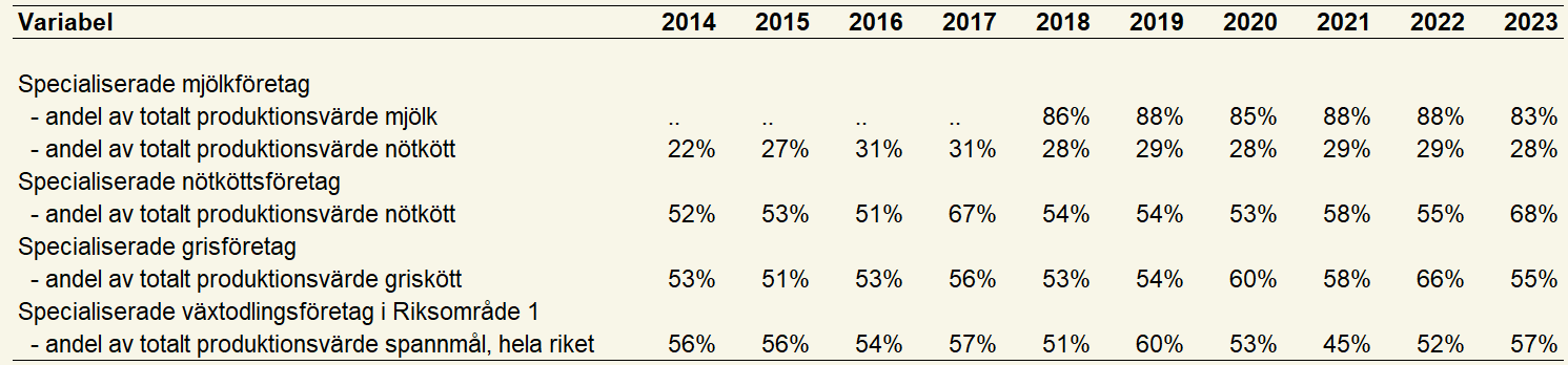 Tillsammans svarade de fyra specialiserade driftsinriktningarna som redovisas i JEU för 58 % av det totala produktionsvärdet för jordbruket i Sverige. Det är i nivå med genomsnittet för åren 2014–2022.