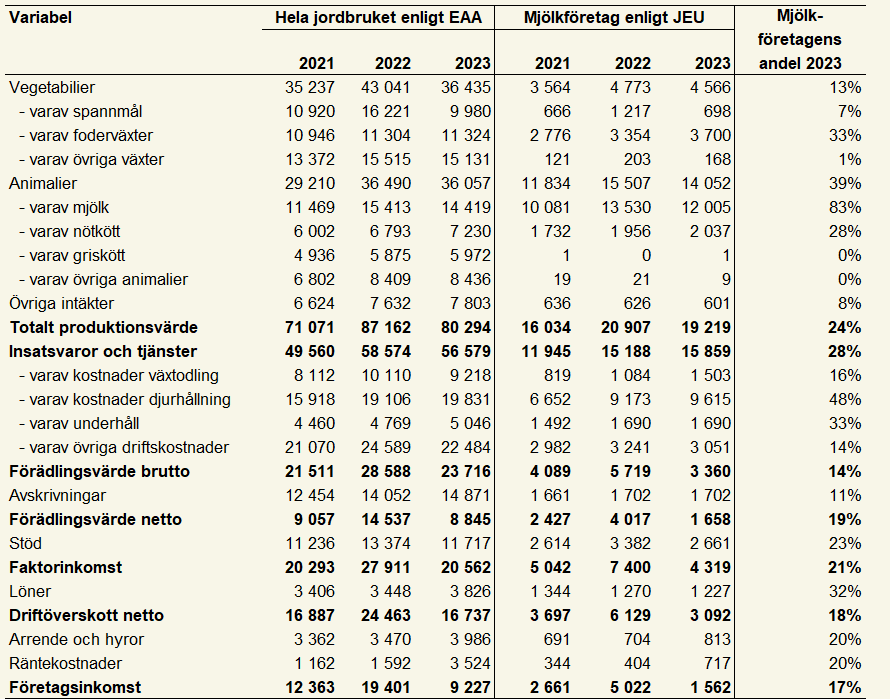Specialiserade mjölkföretag skapade 83 % av det svenska produktionsvärdet för mjölk och närmare en fjärdedel av hela jordbrukssektorns produktionsvärde. De skapade drygt en sjundedel av jordbrukssektorns förädlingsvärde brutto och låg bakom en dryg sjättedel av jordbrukssektorns företagsinkomst år 2023, vilket är 9 procentenheter mindre än år 2022.