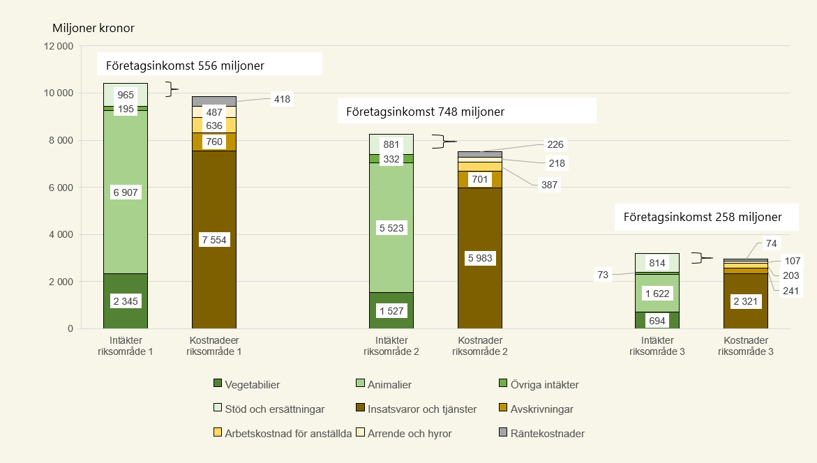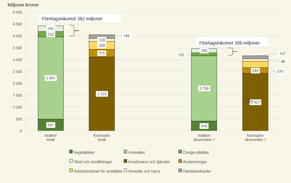 Produktionsvärdet för specialiserade mjölkföretag varierade mellan 13 och 21 miljarder kronor åren 2014–2023 (se tablå 2) där det högst uppmätta avser 2022. Ungefär 65 % av intäkterna brukar genereras i mjölkproduktion, 10 % i slakt och livdjursförsäljning och drygt 20 % av intäkterna brukar genereras i vegetabilieproduktion. Torkåret 2018 var ett undantag då intäkterna från vegetabilier var ungefär hälften mot normalt. Intäkter från slakt och livdjursförsäljning ingår i intäktsposterna för respektive djurslag, liksom lagerförändringar. Lagerförändringarna tar emellertid ut varandra över tid.