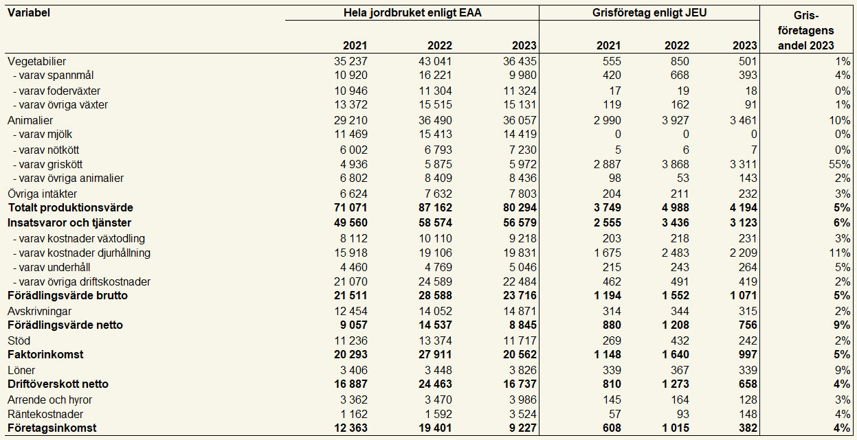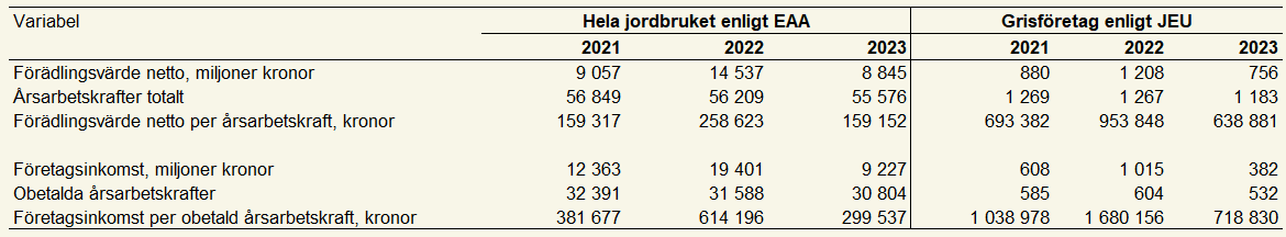 - För specialiserade grisföretag var indikatorn högst och uppgick till 719 000 kronor (vilket var 57 % lägre än 2022). Indikatorn uppgick till 783 000 kronor i södra och mellersta Sveriges slättbygder och varierade mellan 626 000 kronor och 771 000 kronor beroende på företagets storlek.