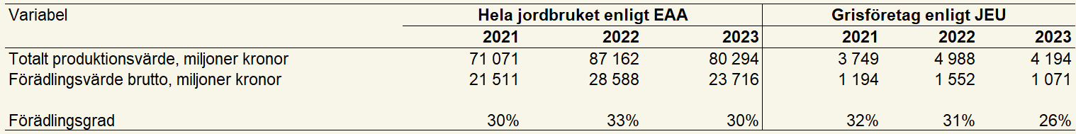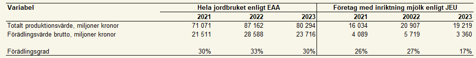 Förädlingsgraden för specialiserade mjölkföretag enligt JEU har varit lägre än genomsnittet för jordbruksföretagen i Sverige enligt EAA samtliga alltsedan 2014. När värdet av egenproducerat foder har rensats bort från intäkts- och kostnadssidan har däremot förädlingsgraden för specialiserade mjölkföretag enligt JEU överstigit genomsnittet för jordbruksföretagen i Sverige enligt EAA till och med 2022. Så blev dock inte fallet år 2023 då förädlingsgraden blev 24 % lägre för de specialiserade mjölkföretagen jämfört med genomsnittet för jordbruksföretagen i Sverige enligt EAA.