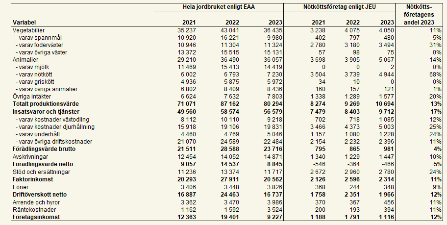 The holdings focused in dairy, beef, pig and crop production reported in JEU, accounted for about 57 % of the total value of production in Swedish agriculture 2023.