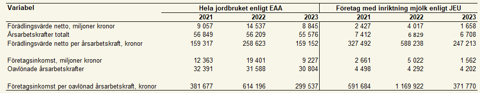 Företagsinkomsten dividerad med antalet oavlönade årsarbetskrafter för specialiserade mjölkföretag var drygt 370 000 kronor, medan de genomsnittliga svenska jordbruksföretagen generade nästan 300 000 kronor år 2023. De specialiserade mjölkföretagen hade nästan 25 % högre företagsinkomst per oavlönad årsarbetskraft jämfört med jordbruksföretag i genomsnitt enligt EAA 2023, år 2022 var företagsinkomsten per oavlönad årsarbetskraft nästan dubbelt så hög jämfört med genomsnittet för jordbruksföretag enligt EAA. Tittar vi tillbaka ytterligare ett år, det vill säga på år 2021, kan vi notera att företagsinkomsten per oavlönad årsarbetskraft enligt JEU istället var drygt 55 % högre för specialiserade mjölkföretag jämfört med genomsnittet för jordbruksföretag i Sverige det året. Det förekommer således stora variationer mellan år.