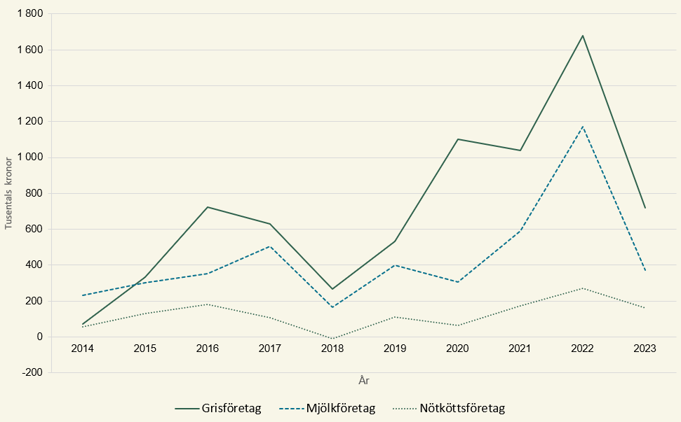 - För specialiserade nötköttsföretag var indikatorn lägst och uppgick till 163 000 kronor (vilket var 40 % lägre än 2022). Indikatorn varierade mellan 124 000 kronor och 427 000 kronor beroende på om företaget låg i norr eller söder och varierade mellan negativa 50 000 kronor och positiva 349 000 kronor beroende på företagets storlek.