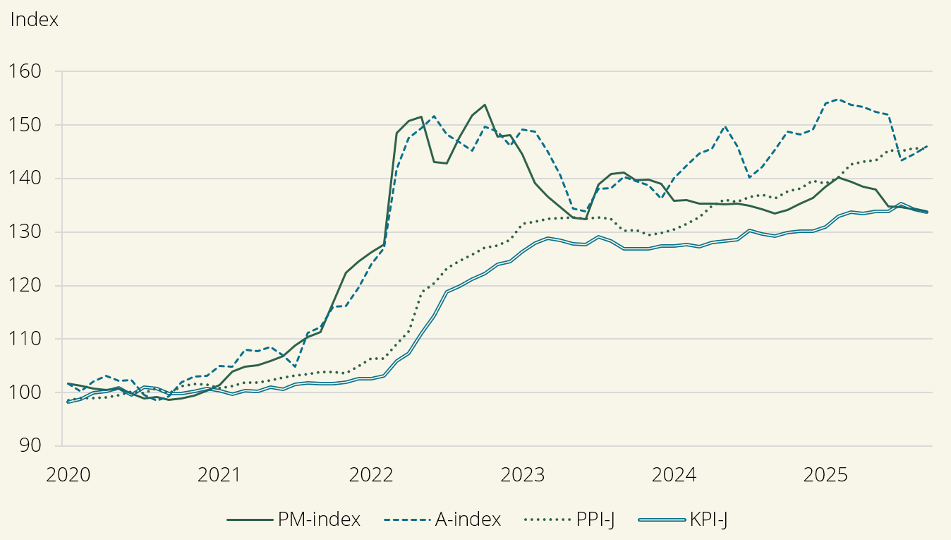 Förstora bildenFigur A. Utvecklingen av PM-index, A-index, PPI-J och KPI-J (2020=100)