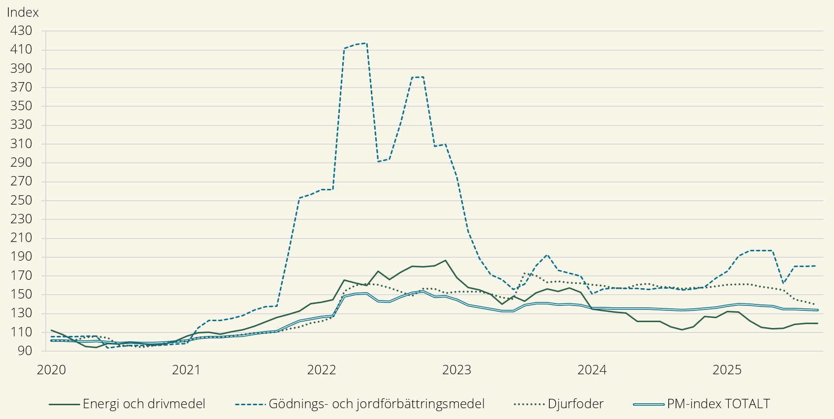 De genomsnittliga priserna för produktionsmedel ökade enligt Produktionsmedelsprisindex (PM-index) med 0,2 % mellan september 2024 och september 2025. Priserna för produktgruppen Gödnings- och jordförbättringsmedel ökade tydligast (+16,6 %). Under samma period ökade Avräkningsprisindex (A‑index) med 0,5 %. Blommor och plantskoleväxter var den produktgrupp där priserna ökade mest (+13,3 %).