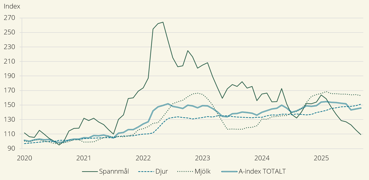 I senare led steg de genomsnittliga priserna som ingår i Producentprisindex för livsmedelsindustrin, jordbruksreglerade livsmedel (PPI-J) med 6,7 % mellan september 2024 och september 2025 medan Konsumentprisindex för jordbruksreglerade livsmedel (KPI-J) ökade med 3,4 %.