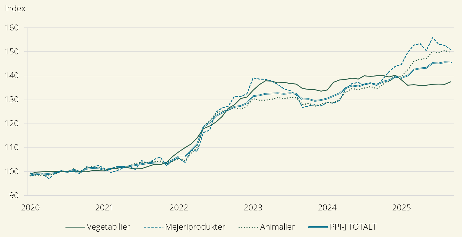 Producentprisindex för livsmedelsindustrin, jordbruksreglerade livsmedel (PPI-J) steg med 6,7 % mellan september 2024 och september 2025. Priserna för Vegetabilier minskade med 1,7 % medan priserna för Animalier steg med 11,2 %.