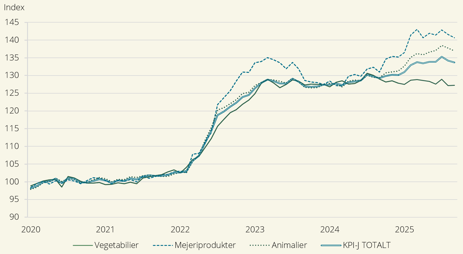Konsumentprisindex för jordbruksreglerade livsmedel (KPI-J) ökade med 3,4 % mellan september 2024 och september 2025. Priserna för Vegetabilier minskade med 1,4 % medan priserna för Animalier ökade med 5,8 %.