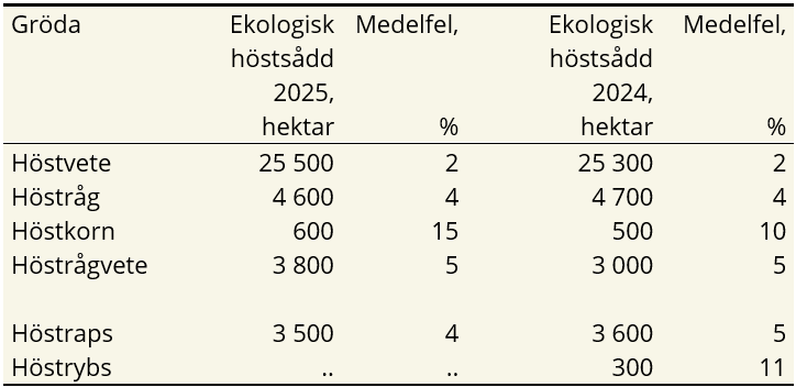 Den ekologiskt odlade höstrågvetearealen uppgår till 3 800 hektar, vilket är 27 % större än fjolårets areal. Den ekologiskt odlade höstrågarealen uppgår till 4 600 hektar och ligger i nivå med fjolårets areal. Arealen ekologiskt odlat höstkorn uppgår till 600 hektar.