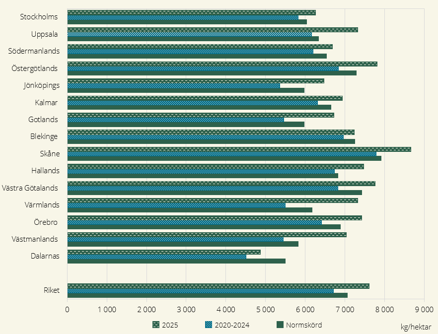 This report provides preliminary results for the year 2025 on the yield per hectare and total production of cereals, dried pulses and oilseed crops. The results are presented for counties, production areas and for all of Sweden.