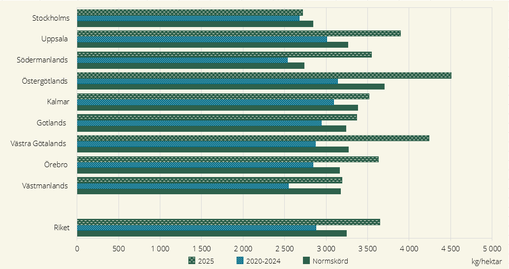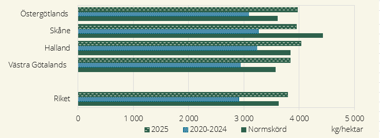 Det bör noteras att i femårsgenomsnitten är de låga hektarskördarna från 2023 ett av de fem åren som ingår i beräkningen. Det kan därför vara relevant att jämföra årets hektarskördar även med normskördarna, som är beräknade utifrån en längre tidsserie av tidigare års hektarskördar och en trendfaktor.