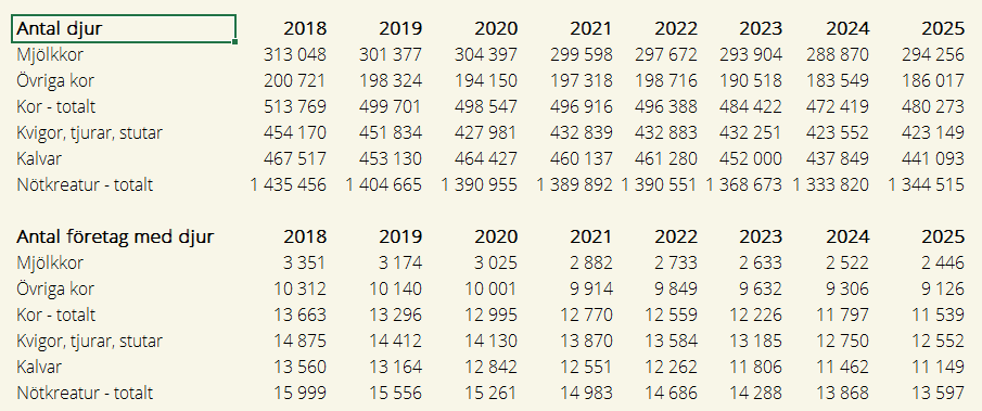 Det totala antalet nötkreatur i Sverige beräknas ha uppgått till 1 344 500 stycken i december 2025, en ökning med 0,8 % jämfört med december 2024. Alla redovisade kategorier har ökat, med undantag för kvigor, tjurar och stutar. Antalet mjölkkor har ökat med 5 400 djur, vilket motsvarar en ökning på 1,9 % mellan december 2024 och december 2025. Under samma period har antalet kor som används för kalvuppfödning ökat med 2 500 djur (1,3 %) och antalet kalvar med 3 200 djur, vilket är en ökning på 0,7 %. Trots ökningen av antalet mjölkkor är det totala antalet nötkreatur lägre än för två år sedan.