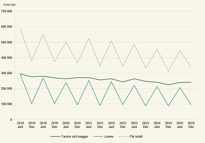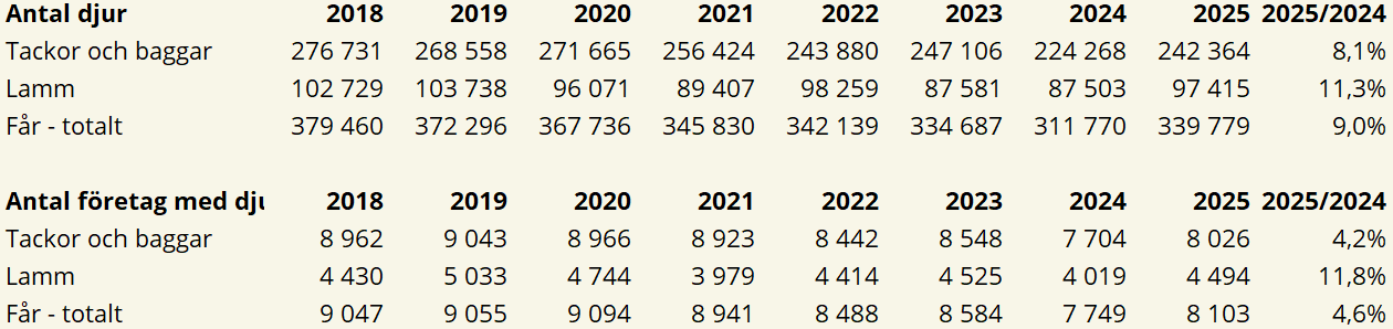 Antalet lamm i december 2025 var drygt 11 % fler än i december 2024 medan antalet tackor och baggar istället ökade med ca 8 % under samma period.