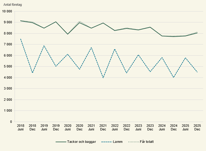 Antalet jordbruksföretag med får i december ökade relativt mycket mellan december 2024 och december 2025 (se Tablå A). Detta efter att antalet företag med får minskat kraftigt året innan. Totalt fanns drygt 350 fler jordbruksföretag med får i december 2025 än i december 2024. Antalet företag med får var i december 2024 det lägsta som uppmätts.