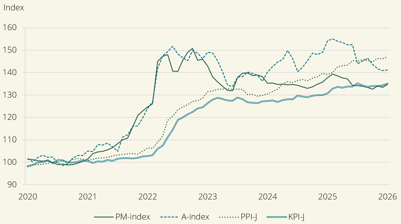 Förstora bildenFigur A. Utvecklingen av PM-index, A-index, PPI-J och KPI-J (2020=100)