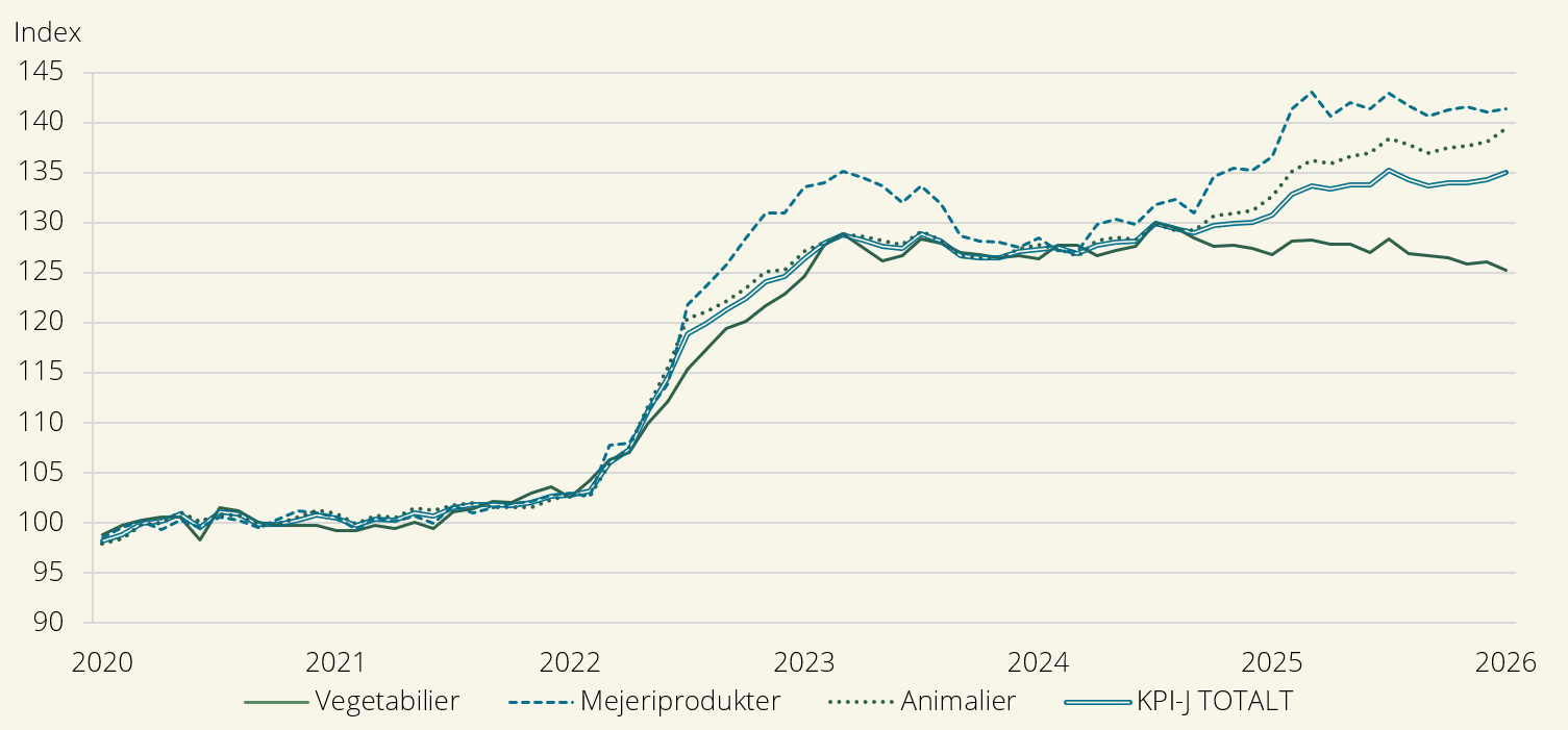 Konsumentprisindex för jordbruksreglerade livsmedel (KPI-J) ökade med 3,3 % mellan januari 2025 och januari 2026. Priserna för Vegetabilier minskade med 1,2 % medan priserna för Animalier ökade med 5,1 %.